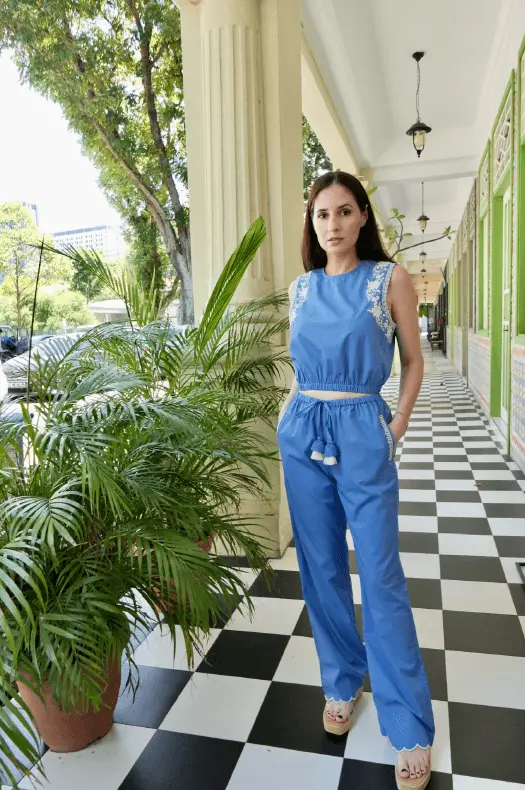Relaxed style meets refined detail in the Croatia Sleeveless Embroidered Pants Set. Crafted from 100% cotton, this lightweight two-piece is breathable, versatile, and perfect for warm-weather days. The sleeveless top is finished with an elasticated hem for a comfortable yet flattering fit, while ivory floral embroidery along the shoulders and sleeves adds a touch of artisanal elegance.